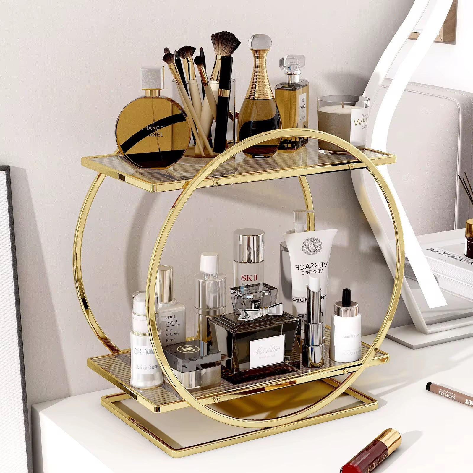 Apportez une touche de luxe et d’élégance à votre espace beauté avec cette superbe étagère de rangement en métal doré. Son design circulaire moderne et raffiné permet d’organiser parfaitement vos produits de maquillage, parfums, soins de la peau et accessoires tout en décorant votre coiffeuse ou votre salle de bain.